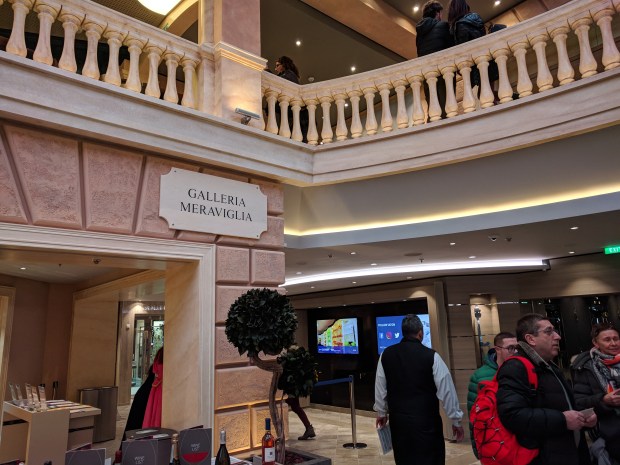 Si tratta della Galleria Meraviglia, il ponte principale, pieno di negozi e dolci tentazioni. La gioielleria è proprio di fronte alla cioccolateria, di fianco al punto di prenotazione delle escursioni, non distante dalla Spa, dal parrucchiere e dalla saletta per la manicure.