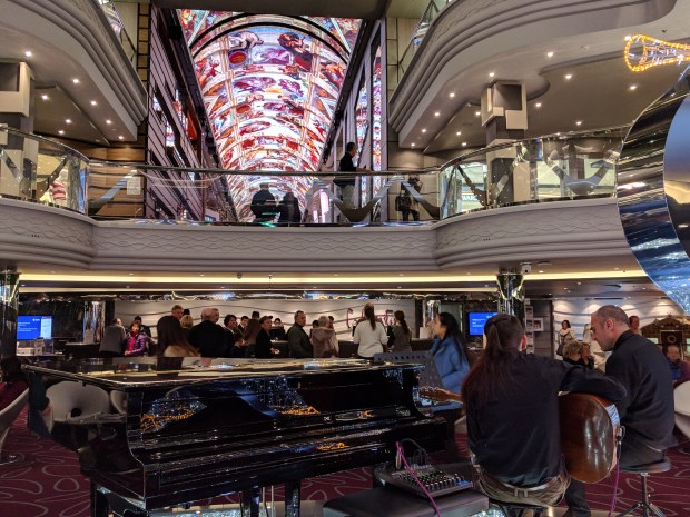 Il passaggio dalla terra ferma al mare avviene al Porto Antico, passando attraverso la Stazione Marittima: al piano interrato si fa il check-in e in sala di attesa si aspetta di essere chiamati. C’è poi l’imbarco, che prevede il controllo del proprio biglietto e della carta d’identità, prima di passare sotto il metal-detector. Ecco fatto, si è dentro. Si seguono le scale rivestite di moquette color porpora o si prendono gli ascensori specchiati per raggiungere la sala principale, quella con le scale che brillano di swarovski. Qui non manca l’intrattenimento di musicisti internazionali, mentre si intravede la cupola luminosa della galleria al piano superiore che cambia faccia allo scorrere del tempo.