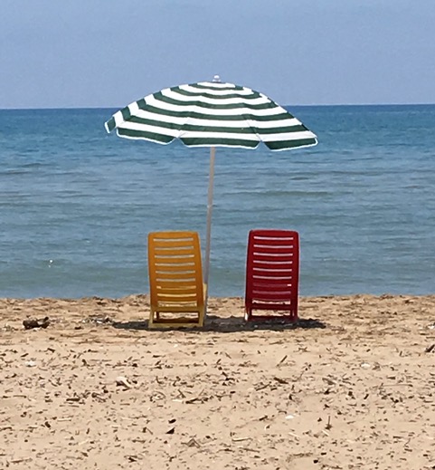 Facciamo tanti giri di un giorno mentre restiamo in questa casa, ma siamo sempre felici di ritornare e vedere di nuovo questo panorama. La sera prendiamo due bicchieri e una bottiglia di vino e mettiamo le nostre sedie di plastica sulla sabbia così vicino all’acqua da poterci sedere con i piedi in mare. Auguriamo “buonasera” a chi passa e scambiamo qualche parola con loro, e tra noi parliamo della nostra giornata, delle nostre speranze e dei nostri progetti per il futuro.