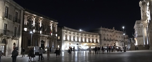 Costruito su e con i resti di un tempio greco, vediamo i pilastri del tempio originale incorporati nelle grandi mura del Duomo di Siracusa. Sta per cominciare un matrimonio; gli ospiti si raccolgono sul pavimento di marmo della piazza, le donne con i vestiti eleganti, di tanti colori e gli uomini che portano abiti scuri e gli occhiali da sole, sono tutti indossati con stile. Gruppi si formano e, all’arrivo dei nuovi ospiti, si dividono e si riformano e l’aria diventa piena di chiacchiere. Prendiamo posto a un tavolo del ristorante opposto, ordiniamo qualcosa da bere e facciamo il solito gioco mentre osserviamo la gente; chi è la più elegante? Che relazione c’è tra quei due? Queste due qui devono essere madre e figlia, la somiglianza non si può negare.