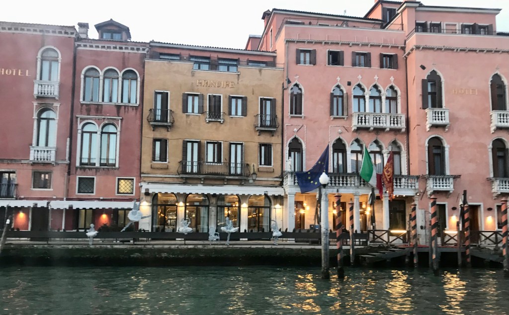 Siamo scese a Zattere, vicino all’albergo, non più di 300 metri. Dall’imbarcadero avevamo solo bisogno di camminare dritto, girare a destra lungo un canale fino a un ponte, e infine girare a sinistra prima di vedere l’albergo. Avevamo passato ristoranti e negozi lungo il tragitto. I ponti e i canali erano affascinanti, specialmente al buio. L’albergo non ci ha deluse. Era davvero bello con pareti in stucco color pesca e persiane marroni che accentuavano le sue finestre ad arco a punta moresche.